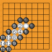 黒1からアタリをかけ、白2と逃げても黒3とまたアタリとし、白4の逃げには黒5のアタリとします。このように常にアタリ、アタリと白を追い詰め最後には黒15までで白を取り上げるテクニックです。これを「シチョウ」といいます。