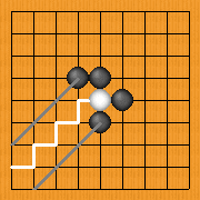 アタリ、アタリと白を追い詰めるのは「シチョウ」でしたが、こちらは網をかけて包囲するようなテクニックで「ゲタ」といいます。