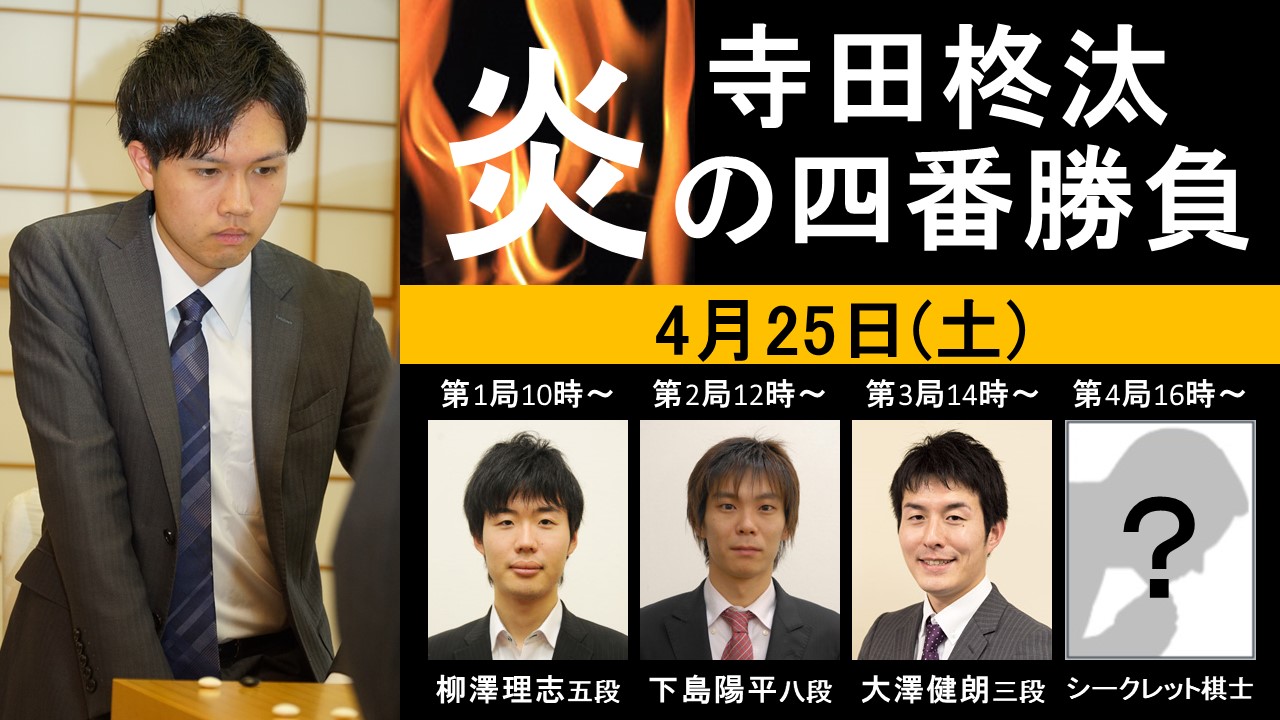 局 対局時刻 勝敗 対局者 結果 対局者 勝敗 第1局 10時~ 寺田柊汰初段 時間切れ △柳澤理志五段 ◯ 第2局 12時~ △寺田柊汰初段 11目半 下島陽平八段 ◯ 第3局 14時~ ◯ 寺田柊汰初段 半目 △大澤健朗三段 第4局 16時~ △寺田柊汰初段 中押し シークレット棋士