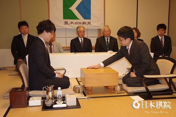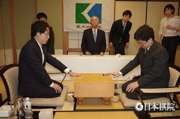 山下九段「タイトル戦だとホテルと駅や空港の往復だけのようになってしまい、行った所をすぐに忘れてしまうのですが、熊本は非常に印象深く記憶が残っておりまして、初めてタイトル戦に出させて頂いたのが碁聖戦で、(※第25期)その時の1局目を熊本でやらせて頂きました。その対局で勝たせて頂き、いろいろタイトルを取ることができるようになりましたので、熊本の皆様のおかげかなと思っております。2連敗と苦しい状況ですけれども、自分の始まりの場所でもあるこの熊本で、また新たなスタートが切れればいいなと思っております。地震で本当に大変なことになってしまいまして、自分は碁を打つことしかできませんけれども、碁を見て頂いている間だけでも辛かった事を少しでも忘れて頂けるように、内容の素晴らしい皆様が熱くなれるような対局をお見せしたいと思います」