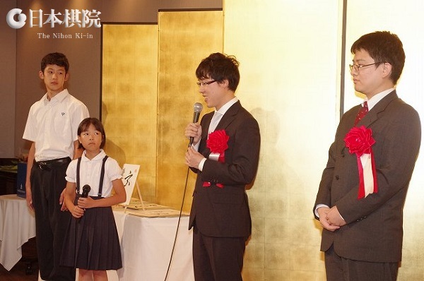 井山碁聖「熊本にはいろいろな棋戦で数多く来させて頂いておりますが、いつもこのようにあたたかく迎えて頂いて本当に感謝の気持ちでいっぱいです。昨年熊本で大きな地震があって、いまだに大変な思いをされている方も大勢いらっしゃるとお聞きしますし、今年も九州で大雨の被害があり、本当に大変な事が続いたため棋士として何かできればという思いはあります。対局でベストを尽くして九州の囲碁ファンの皆様に喜んでいただけるような戦いをすることが一番の役目と思っていますので、明日はそういう気持ちで精一杯碁盤に向かいたいと思います。今日はお子さん達もたくさん来て頂いて私自身もパワーを貰いましたし、お子さんたちにもこの機会を感じてもらえるような与えられるような碁が打てればと思います」