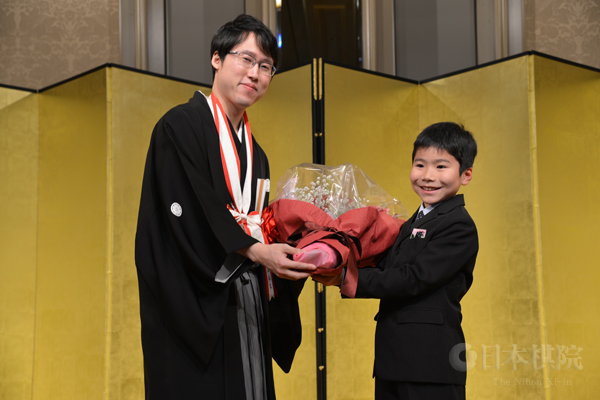 この後、第7回くらしき吉備真備杯こども棋聖戦低学年の部準優勝の桑原樹さんから花束を贈られると、井山棋聖は嬉しそうに微笑んで受け取った。