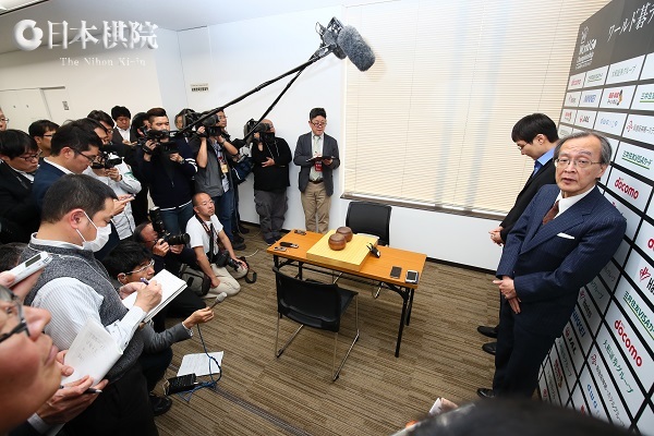多くの報道陣が対局室へなだれ込む。対局室のインタビューとぶら下がり取材が終わり、検討の足りなかった(?)井山は日本棋士の集まる控室に立ち寄り、趙治勲名誉名人をはじめ多くの棋士と検討を続けた。