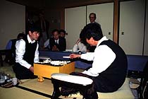 The fourth game of the 24th Kisei title match was played at Gero Hot Spring in Gifu Prefecture on 16 and 17 February. After the first fight of the middle game, Cho Chikun, playing black, took the lead and seemed to be headed towards a 3-1 lead in the title match. O Rissei fought back hard, but Cho hung on to his lead. However, he started playing erratically in byo-yomi, and O managed to kill a large group. O commented later that he had been on the point of resigning.