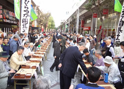 About 7,500 go fans gathered together for The 16th Hiratsuka Igo festival on 9th October. Hiratsuka was the place where the very famous `Kitani School' was held by Kitani Minoru 9P. More than 80 pros including Otake Hedeo, Takemiya Masaki and Rin Kaiho gave simultaneous games to 1,800 go fans on a shopping arcade. A European go fan from Belgium who took part in the event said `It's incredibly amazing!! I've never seen such a number of simultaneous games and pros!'