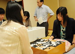 Hsieh and Okuda Aya 3p making her first title challenge, played for the third game of The 31th Women's Honinbo title match at The Nihon Ki-in in Tokyo on 16th October 2012. Hsieh (W) defeats Okuda by 4.5 points and defends the title with straight wins (3-0). Okuda could not win her first title.
