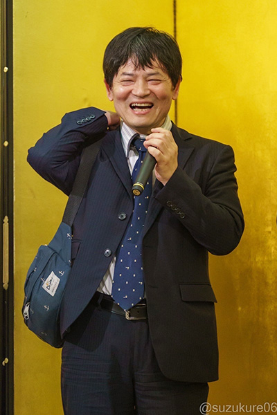 金屏風の前で満面の笑みを浮かべる酔碁(?)の使い手、小県真樹九段