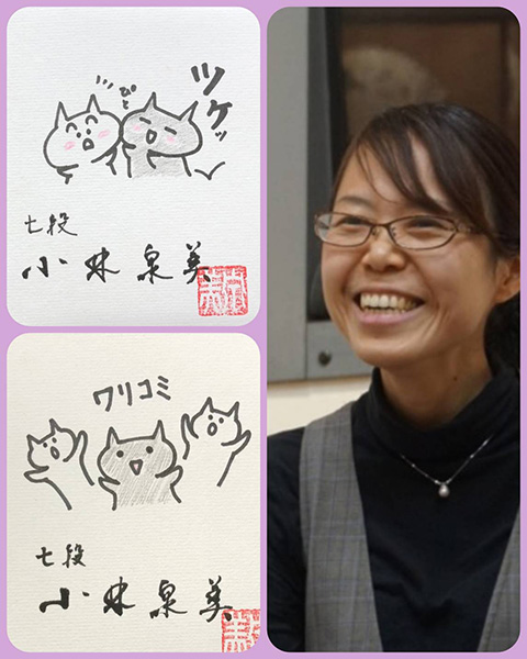 次は右下の絵、こちらはご覧になったことがある方もいらっしゃるでしょう。小林泉美七段の絵付きサイン色紙です!