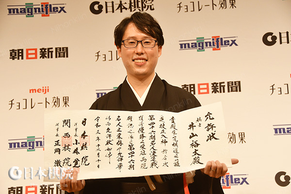 第46期名人戦七番勝負を制した井山裕太名人(32)の就位式が12月10日に行われた。会場は東京都文京区の「ホテル椿山荘東京」。式では、小林覚日本棋院理事長から允許状、朝日新聞社の中村史郎代表取締役社長から賞金3千万円の目録、協賛の株式会社明治からチョコレート効果1年分が贈られた。