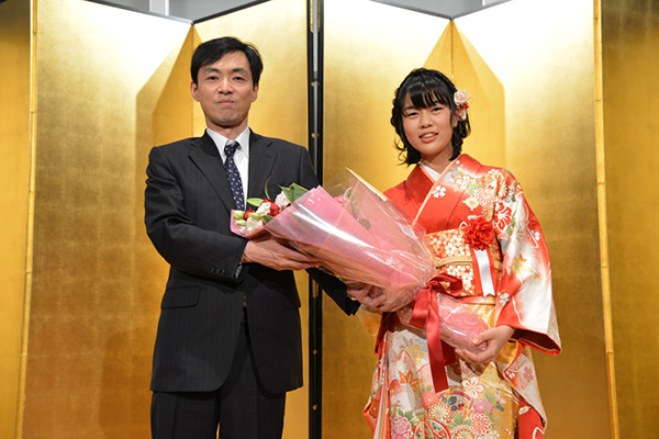 第21期女流棋聖就位式にて。上野女流棋聖と藤澤八段。