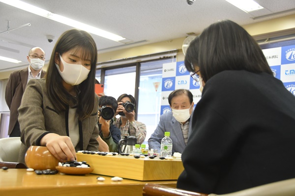- ○ 対局後、休憩していたらドアが開いてビックリしたのですけど、まさかの菫ちゃんでした(笑)。その後、一緒に碁の振り返りをして、打ち上げ会場に行くまでは同じ車で「名探偵コナン」の話で盛り上がりました。2人ともおしゃべりなので(笑)。菫ちゃんとは研究会が一緒なのですが、この日も研究会の後のような雰囲気で。この切り替えのはやさも菫ちゃんの長所だと思います。