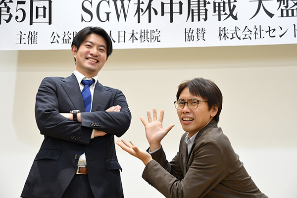 第5回SGW杯中庸戦本戦が10月29日、30日に行われ、鶴山淳志八段が優勝しました。見どころ解説などをしていただいた林漢傑八段に今大会を振り返っていただこうとしたところ5代中庸がやってきて・・・。