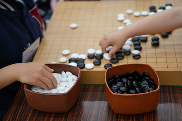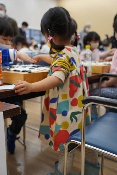 使う碁盤は19路、手合はオール互先。お兄さん、お姉さんと同じ、お母さん、お父さんと同じ、プロ棋士と同じ、本格的な碁盤で戦うのは3歳から6歳のまだ学校に行っていない子どもたちだ。