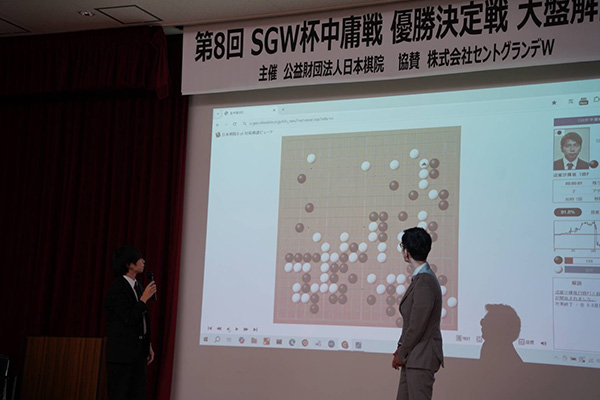 秋山次郎九段と吉原由香里六段による大盤解説が行われ、終局後には両対局者も登壇して戦いを振り返った。