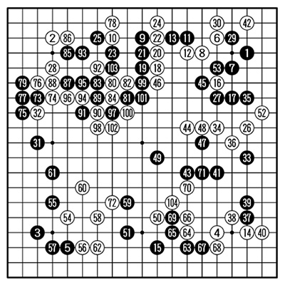 黒・井上春碩因碩 白・本因坊察元 104手以下略、白2目勝ち