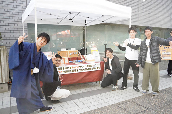 人の流れが落ち着いたところで、メンバーの話を聞いた。メンバーは河原二段(20)、武井太心三段(24)、フィトラ・R・S二段(23)、荒井幹太初段(17)、齋藤藍杜さん(26)。団体の発起人である齋藤さんは元院生で現在は会社員をしながら土日に活動をしている。「プロにはなれなかったけれど、囲碁に関わることをしたいという気持ちがずっとあった」と言う。「仲が良かった武井くんとフィトラくん、河原くんに『一緒に普及活動をしよう』と誘って始めることになりました」