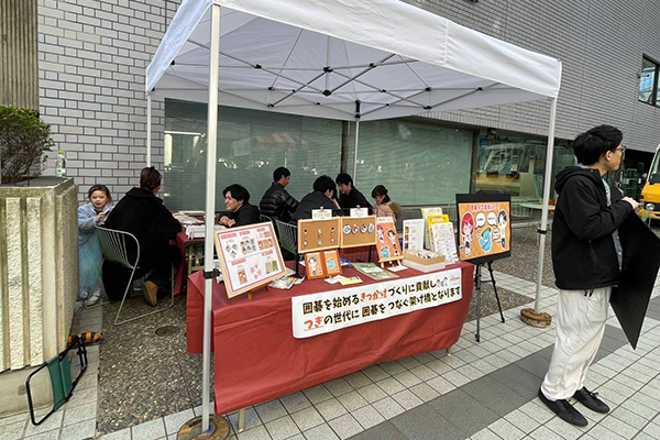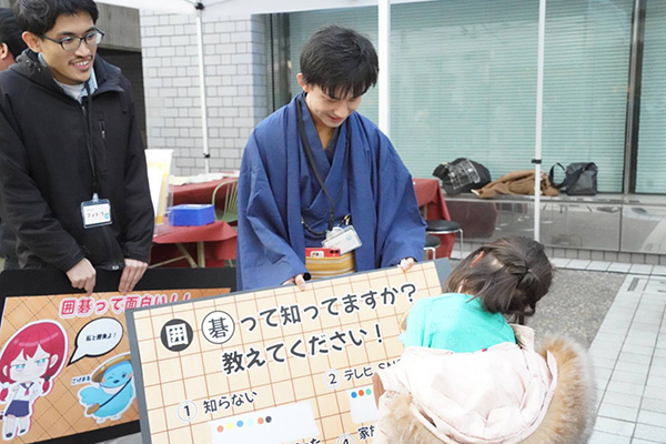 風は冷たいが晴天。ハンドメイドや地域の特産品などの店舗に混ざって、9路番が並ぶ囲碁ブースがあった。記者が行った時には海外ルーツと思しき親子が入門を受けていた。囲碁体験は大人が1000円で子どもは500円。子ども連れの家族が足を止めることが多く、中には習い事の帰りなのか、柔道着を着た少年たちの姿もあった。