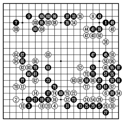 1図 1799年 黒・中野知得(安井知得仙知) 白・本因坊元丈 (106手以下略、白10目勝ち)