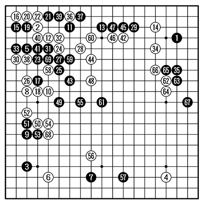 2図 1812年4月 黒・安井知得仙知 白・本因坊元丈 (69手以下略、黒中押し勝ち) 黒69がダメの妙手