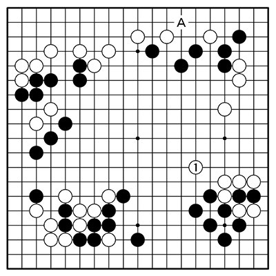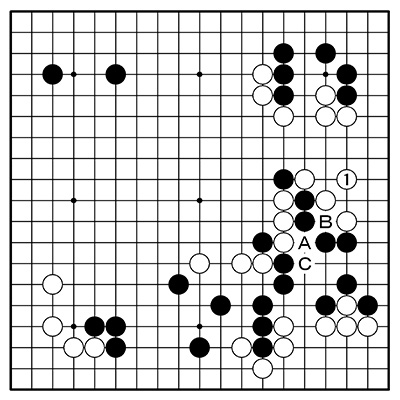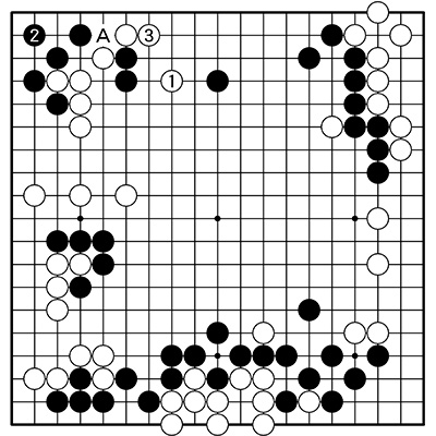 白1と下辺の黒模様化を防いだのが明るい決断。白石七段は「石の流れとしては、白1ではAなど上辺を守る手に目がいくもの。そんな大きな場所がある局面で、白1で勝ち切れる判断を下せるのは素晴らしい」と好評した。