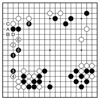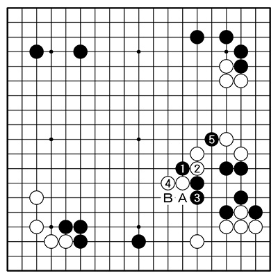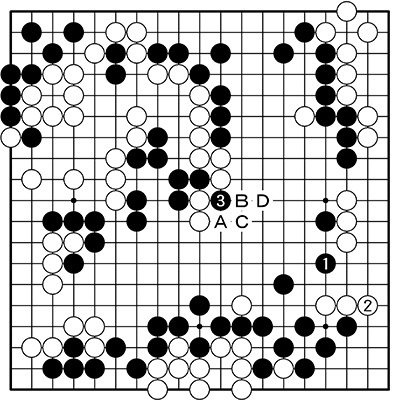 黒1、3と切断して中央の白2子を狙った局面。右辺にある黒石の援軍を背景に、白A以下の動き出しには戦えると判断したもの。「黒1と白2の交換は、先に損をする怖い打ち方。善悪は不明ですが、面白い戦い方です」と白石七段。