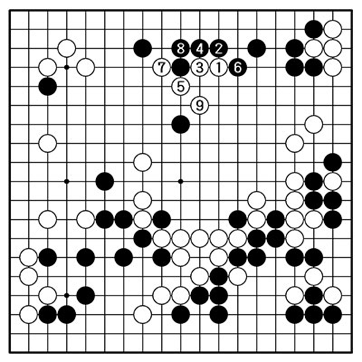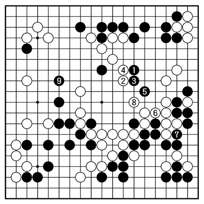 黒番は女子聖学院高等学校の倉谷圭乃さん、白番は千種高等学校の篠原由奈さん。白1の打ち込みは勝負手。「少し深い入り方ですが、白9まで中央の黒を孤立させて、白の言い分が通った形。ただし、この後に黒が冷静な打ち回しでリードを守り切りました」と白石七段。(局面図2に続く)