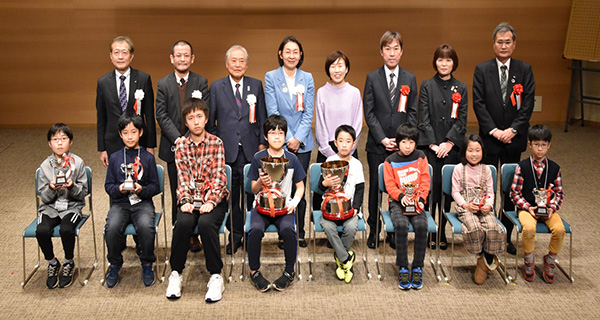 前列左から順に長谷川、若井、楊、三橋(以上高学年の部)、永代、内田、佐溝、花本(以上低学年の部)の各入賞選手