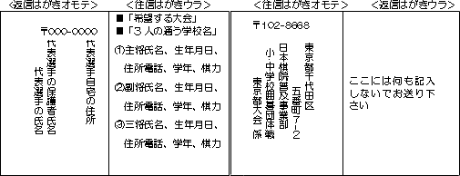 往復はがきに『選抜戦』または『クラス別戦』のいづれか希望する大会を明記し、学校名と主将・副将・三将3人の氏名・生年月日・住所・電話番号・学年・棋力をまとめて記入の上お申し込み下さい。 (主将・副将・三将を決めてください。棋力の強い選手が主将になります。) |