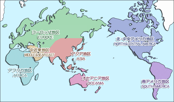 アジア地区 中近東地区 ヨーロッパ地区 アフリカ地区 北・中央アメリカ地区 南アメリカ地区 オセアニア地区