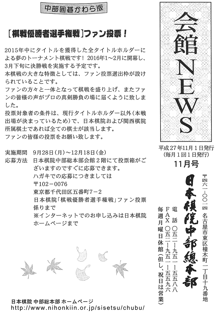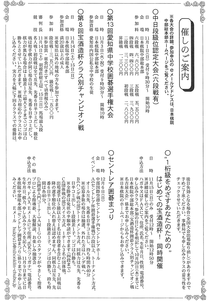 Tweet 2015年10月27日 お知らせ 中部総本部 Tweet 囲碁大会・イベントカテゴリのトップページはこちら 一覧に戻る 前の記事【関西】第41期天元戦挑戦手合五番勝負 第2局 解説会 次の記事【中部】第6回セントレア囲碁まつり