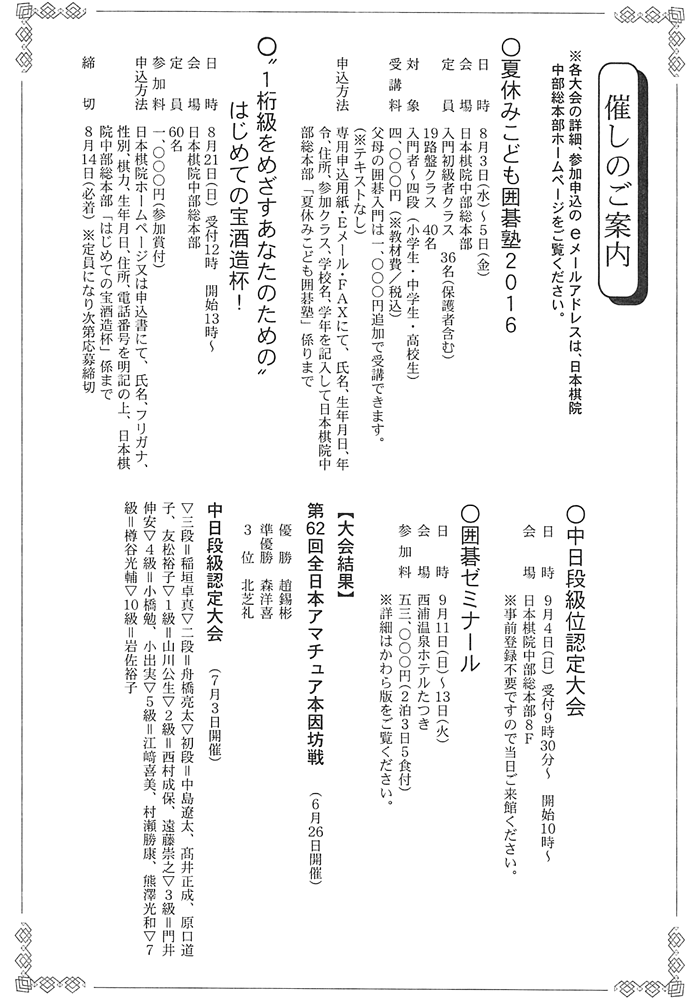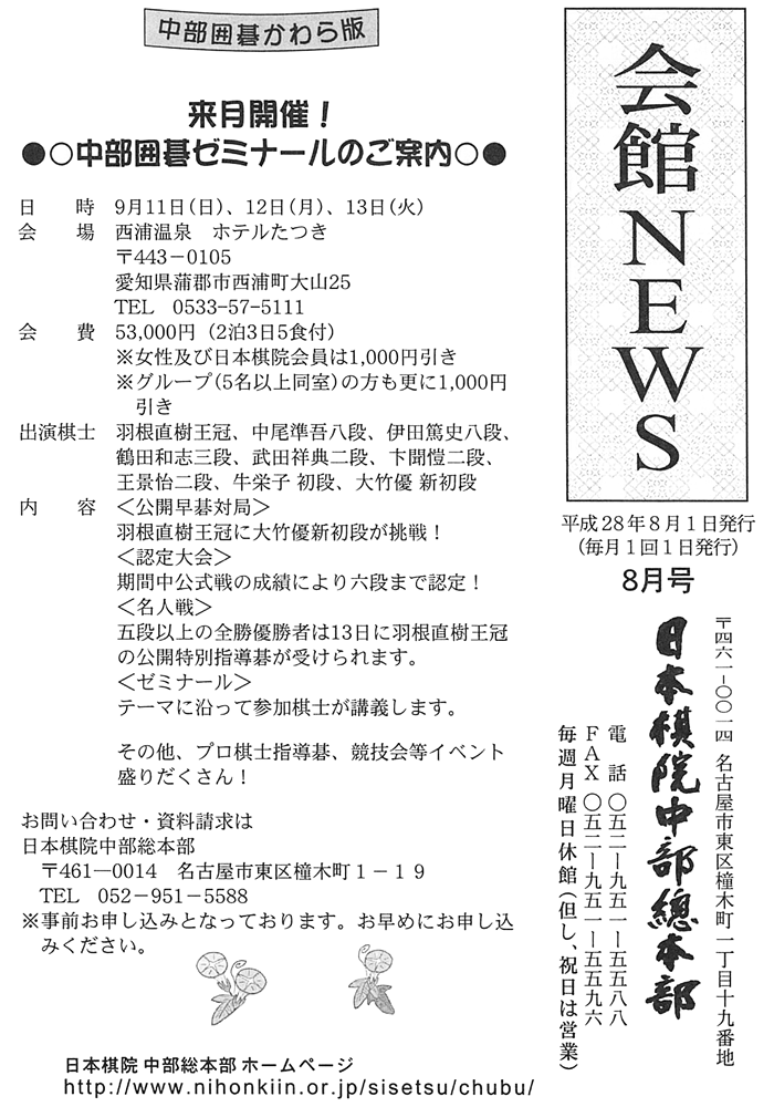 Tweet 2016年08月01日 お知らせ 中部総本部 Tweet 囲碁大会・イベントカテゴリのトップページはこちら 一覧に戻る 前の記事【愛知】中部囲碁ゼミナールのご案内 次の記事【全国】川崎市立東菅小(神奈川)、京都府立洛北高等学校附属中(京都)が優勝【第13回小・中学校囲碁団体戦全国大会】
