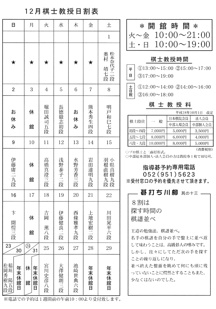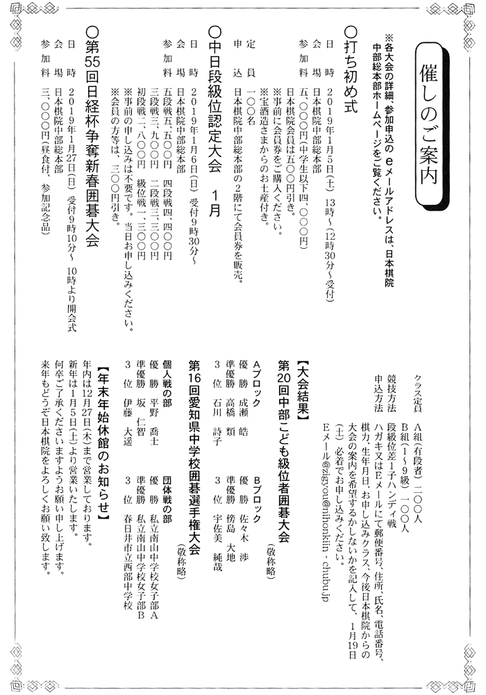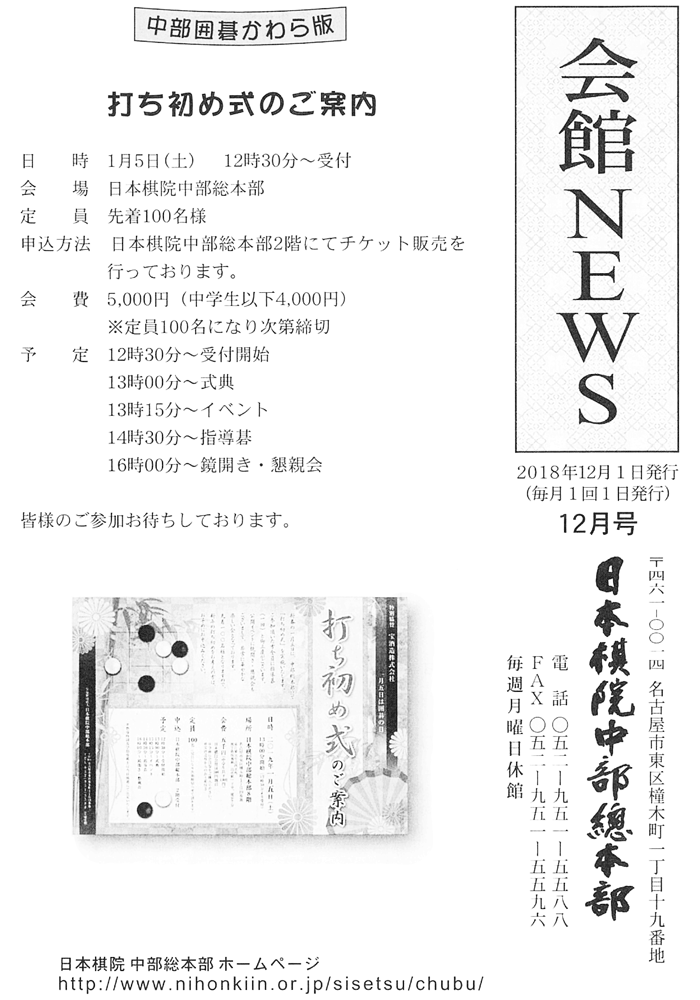Tweet 2018年12月03日 お知らせ 中部総本部 Tweet 囲碁大会・イベントカテゴリのトップページはこちら 一覧に戻る 前の記事【有楽町】段位認定大会 次の記事【千葉】日本棋院津田沼支部(津田沼囲碁クラブ)催し物案内(12月)