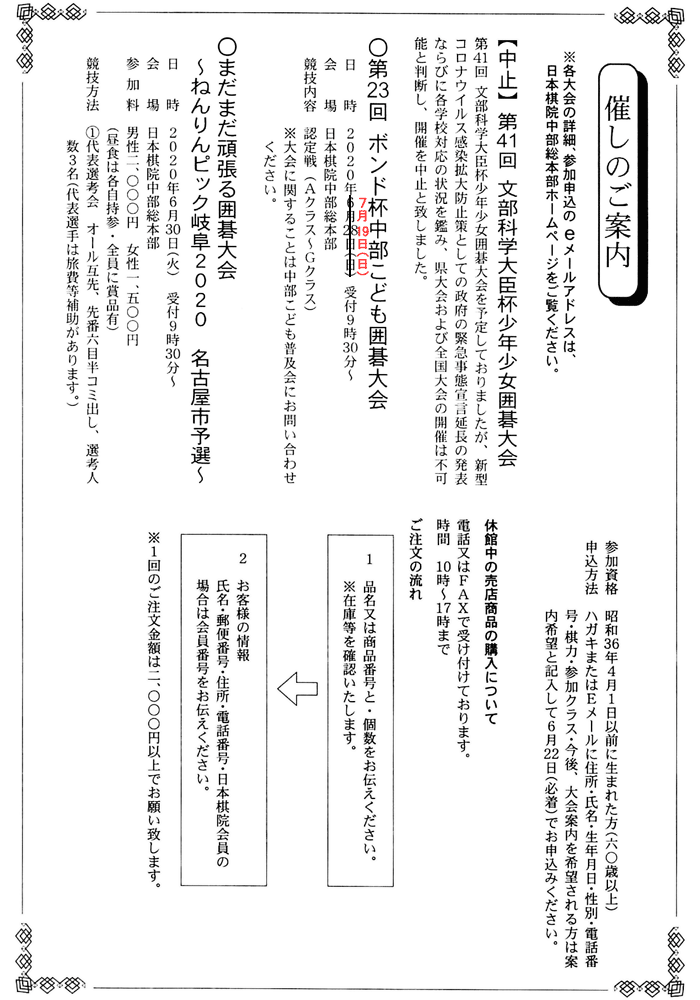 Tweet 2020年05月28日 お知らせ 中部総本部 Tweet 囲碁大会・イベントカテゴリのトップページはこちら 一覧に戻る 前の記事【全国】高校選手権全国大会 中止 次の記事【神奈川】「湘南ひらつか囲碁まつり」開催中止のお知らせ