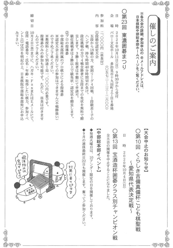 Tweet 2020年09月02日 お知らせ お知らせ 中部総本部 Tweet 囲碁大会・イベントカテゴリのトップページはこちら 一覧に戻る 前の記事【東京本院】第12回関東ジュニアペア碁大会(10月18日開催) 次の記事【千葉】日本棋院津田沼支部(津田沼囲碁クラブ)催し物案内(10月)