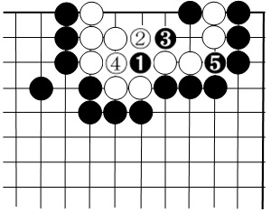 初手は黒1と切り、白2に黒3が好手です。白4と取るよりないですが、黒5と外側からアテれば白死となります。