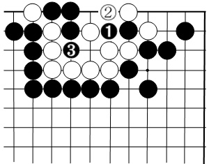 左側の黒3子をアタリにさせないよう、黒1と自ら突っ込んでいくのが正解です。白2と取られますが、黒3と打てば白は一眼しかありません。
