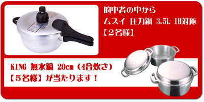 広島アルミ杯・若鯉戦では、優勝者を予想するプレゼント企画を実施いたします。優勝者を見事的中された方から抽選で2名様に「圧力鍋」、5名様に「無水鍋」をプレゼントいたします。