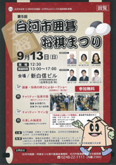 Tweet 2015年08月17日 その他の地域 解説会・イベント 第5回白河市囲碁将棋まつり 日時 9月13日(日) 棋士 武宮正樹九段 青木喜久代八段 小林千寿五段 (将棋棋士:真田圭一七段 飯塚佑紀七段 鈴木環那女流二段) 会場 新白信ビル(福島県白河市立石96白河信用金庫西支店内) 内容 囲碁・将棋の棋士によるトークショー 指導碁・サイン会・お楽しみ抽選会 参加費 無料 詳細はこちら Tweet 囲碁大会・イベントカテゴリのトップページはこちら 一覧に戻る 前の記事【中部】大人のための級位者囲碁大会結果 次の記事【宮崎】第27回日向はまぐり碁石まつり
