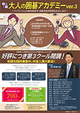 - ※ 講義テーマとは別に毎回、生徒同士の対局棋譜解説、宿題解説、Q&Aコーナー(囲碁に関することすべて)、前回のポイント復習解説、参加回数数回に1局の指導碁。内容については変更する場合がございます。