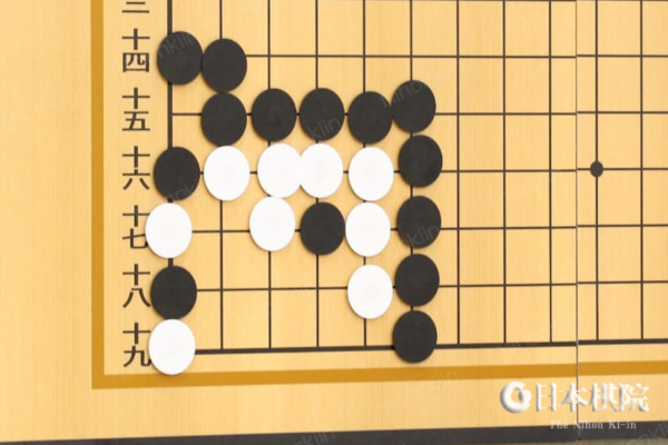 参加者の置いた配石を活かして、河野九段と林八段が即興で詰碁を作成。黒先白死。