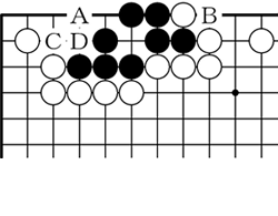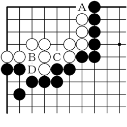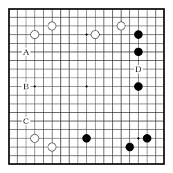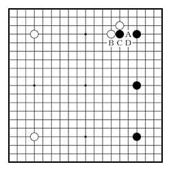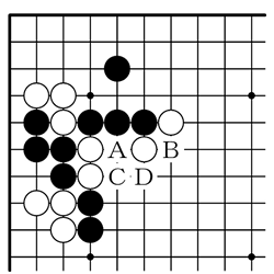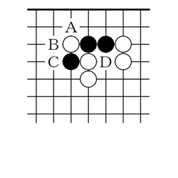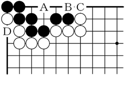 A : 黒死 B : 白死 C : セキ D : 隅のマガリ四目