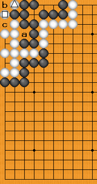 - 白石はaのダメを詰めてもbのダメを有するのでセキ石であり、白の2点を地にするには、さらにb、cへの着手が必要。