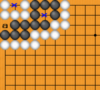 参考図15 このままの状態では、黒白ともに駄目aを有する「活き石」なのでセキ石となってしまい、黒白の目は地にならない。黒白が目を地にするためにはaへの着手が必要。