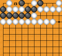 長生になる寸前の形であるが、白がaに手入れすると半目負けのケースで、また黒がaに打つと長生無勝負となり、ともに打たない場合である。