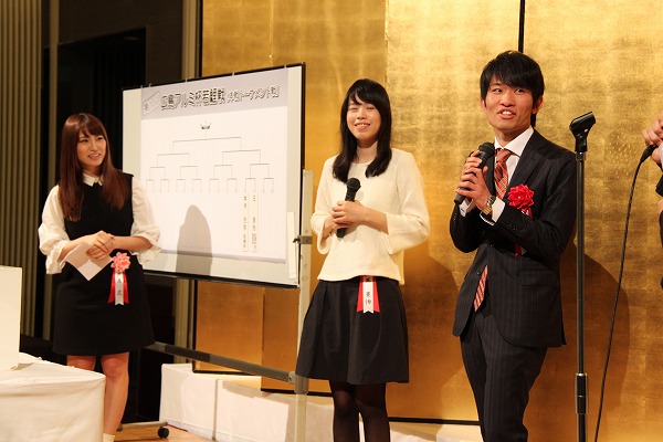 1回戦で対戦する本木若鯉杯(右)と王会津中央病院杯(左は司会の戸島花囲碁大使)