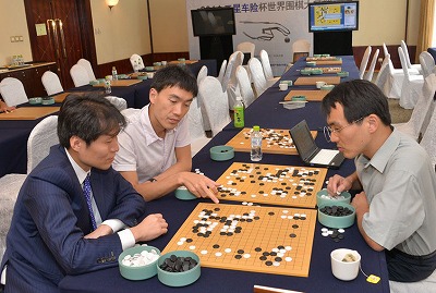 高尾(左)は控室で団長の坂井八段(右)、通訳の潘八段と検討 |
