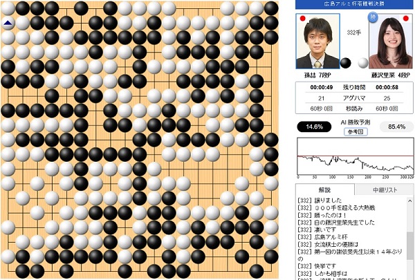藤沢が332手までで白番半目勝ちをおさめ初優勝を飾った。