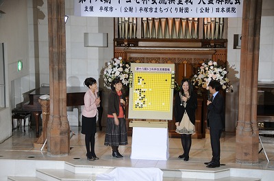 謝依旻女流棋聖に小西和子八段が挑戦する第18期ドコモ杯女流棋聖戦挑戦手合三番勝負の第1局が22日に神奈川県平塚市の「ホテルサンライフガーデン」で行われた。結果は136手までで白番の謝女流棋聖が中押し勝ちをおさめシリーズ先勝となった。