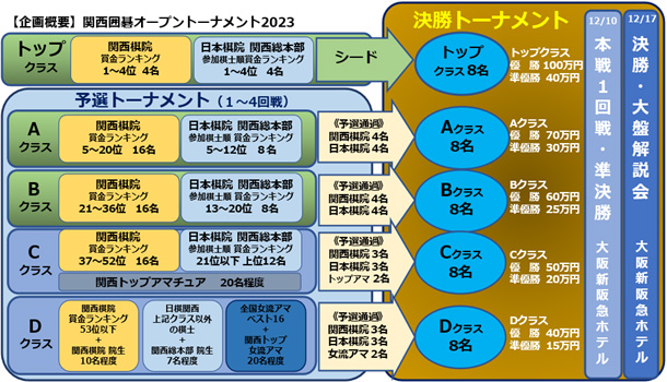 公益財団法人日本棋院(理事長:小林覚)は阪急電鉄株式会社の特別協賛により日本棋院関西総本部および関西棋の所属棋士と関西トップアマチュアらによる賞金ランキング別クラスで争う「関西囲碁オープントーナメント2023」を開催することになりましたのでお知らせします。