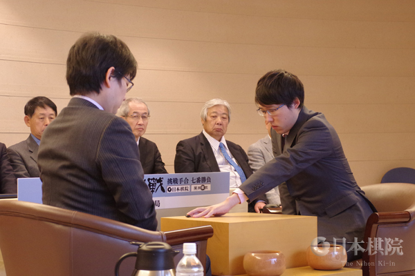 Tweet 2019年01月21日 棋戦情報 井山裕太棋聖に山下敬吾九段が挑戦する第43期棋聖戦挑戦手合七番勝負第2局【主催:読売新聞社】が1月21日(月)に鳥取県境港市の「夢みなとタワー」で始まった。持ち時間は各8時間。1日目は、本日夕刻に封じ手による打ち掛けとなり、22日(火)に2日目が打ち継がれる。 井山(右)が初手を右上隅星に着手し、第2局が始まった 対局の詳細については「週刊碁」およびネット対局「幽玄の間」にてお楽しみください。 Tweet 棋戦カテゴリのトップページはこちら 一覧に戻る 前の記事【1月第4週】「幽玄の間」中継予定 次の記事藤沢里菜四段が女流棋士初の七大タイトル本戦勝利!【第45期天元戦本戦1回戦】